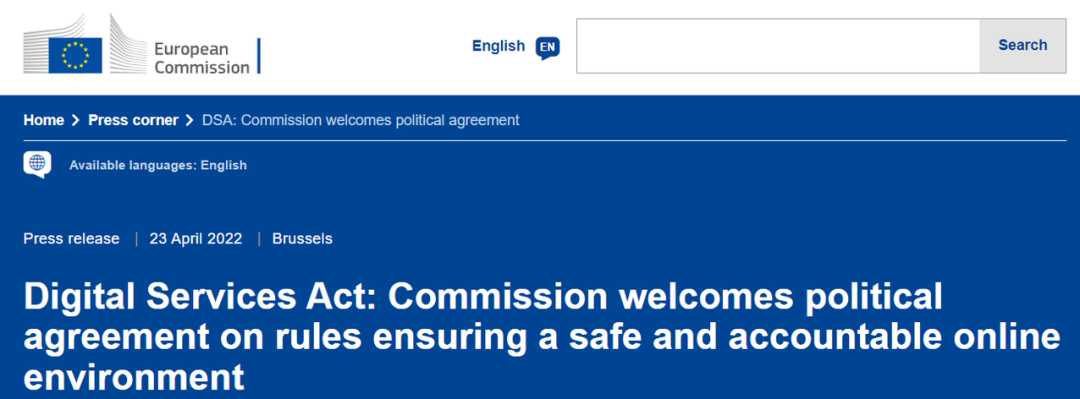 4 月 23 日,经过数小时的谈判,欧盟就《数字服务法》(Digital Services Act,简称 DSA)的广泛条款达成一致。这项法案将迫使科技公司对其平台上出现的内容承担更大的责任。科技公司面临的新的义务包括:更快地删除非法内容和商品,向用户和外部研究员解释他们的算法如何工作,以及对虚假信息的传播采取更严格的行动。