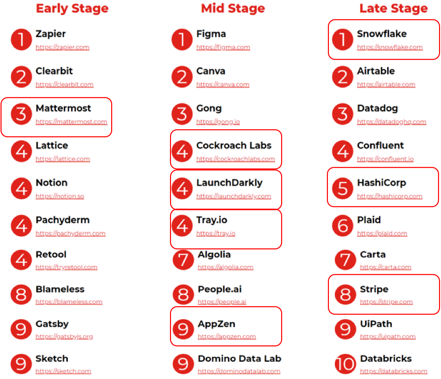 比如Stripe为企业提供省时的付款服务,Snowflake 为企业提供高性能、易扩张的环境去存储大规模的信息,HashiCorp满足了企业日益增长的多云管理的需求,Tray.io通过工作流自动化提高企业的整体效率,LaunchDarkly为企业带来更加高效的产品测试和优化的体验,AppZen帮助企业降低费用滥用和监管不合规的风险。
