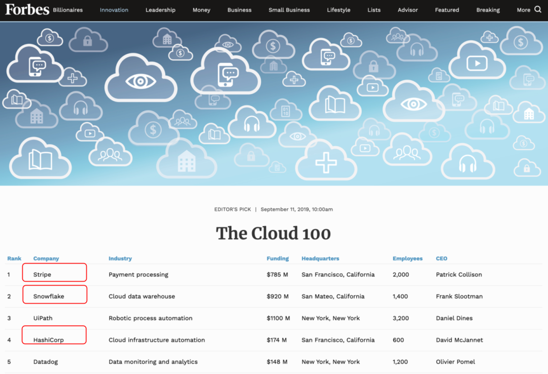 2019年9月11日,由福布斯与Bessemer Venture Partners和Salesforce Ventures合作推出的榜单“福布斯云计算100强”(Forbes Cloud100)正式发布。前五名分别是:Stripe、Snowflake(添加Snowflake文章链接)、UiPath、HashiCorp、以及DataDog。其中,红点创投是第一名Stripe、第二名Snowflake、和第四名HashiCorp的早期投资机构。