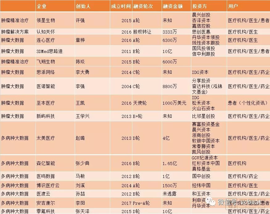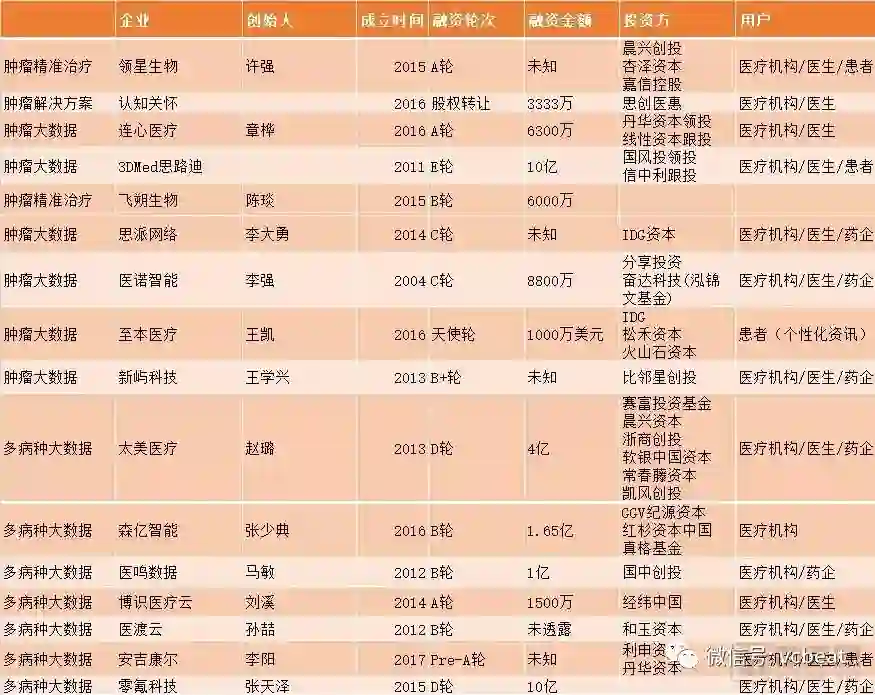 涉及该领域的大公司包括GE Healthcare、Truven Health Analytics、联合健康集团、飞利浦 、 Premier,Inc、SAP、SAS、Siemens Healthineer、Tableau Software,Inc、 施乐、Verisk分析、Allscripts、Sparx IT Solutions、甲骨文等公司。而同国内市场一样,肿瘤市场最为精准医学发展较快的领域,创业公司最多。