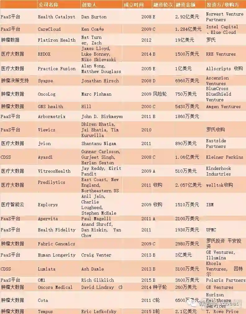 通过总结可以发现国外许多公司主要为医疗服务提供者提供PaaS服务(平台及服务)。将大量数据变为可用性数据后利用人工智能或机器学习提供辅助决策支持。除了创业公司,该领域同样有很多巨头涉足。