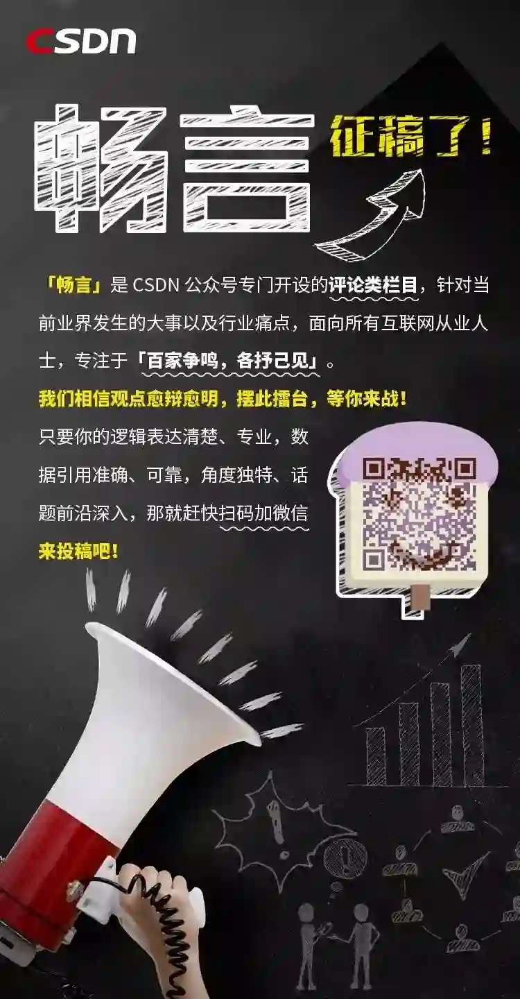 「畅言」是 CSDN 公众号专门开设的评论类栏目,针对当前业界发生的大事以及行业痛点,面向所有互联网从业人士,专注于「百家争鸣,各抒己见」。我们相信观点愈辩愈明,摆此擂台,等你来战!只要你的逻辑表达清楚、专业,数据引用准确、可靠,角度独特、话题前沿深入,欢迎投稿,一起畅所欲言!