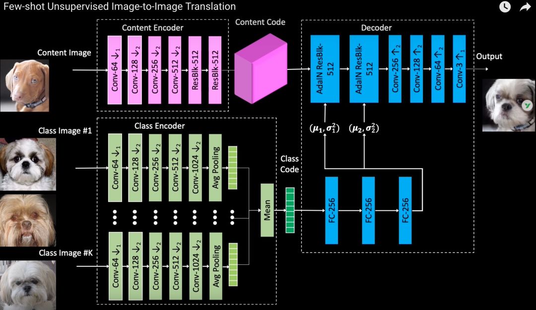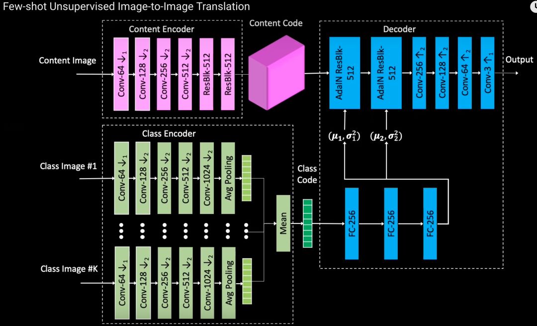 请注意,FUNIT生成器需要两个输入:1)内容图像(红色线圈选)和2)一组目标类图像(绿色线圈选)。 它旨在生成类似于目标类图像的输入图像的转换。