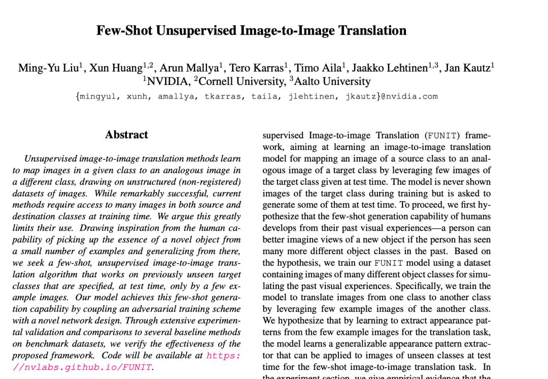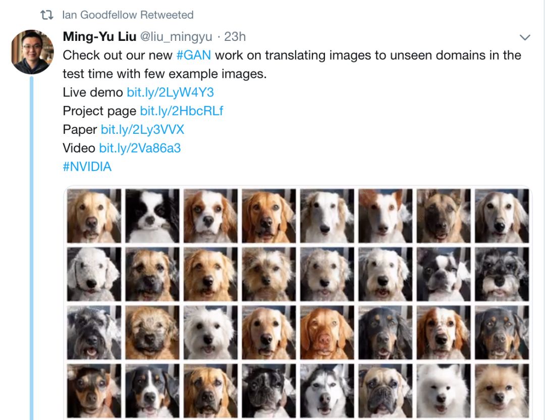 5月9日,英伟达首席研究科学家刘明宇在社交网站公布了其最新研究成果:一种新型的GAN,在测试期间只需几张示例图像,就可以将图像转换为以前从未见过的对象类型。GAN之父Ian Goodfellow也对其进行了转发支持。