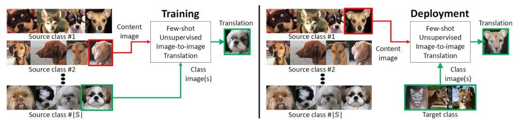 左:训练。 训练集由各种对象类(源类)的图像组成。 我们训练模型来在这些源对象类之间转换图像。右:部署。 我们向训练模型显示目标类的极少数图像,这足以将源类的图像转换为目标类的类似图像,即使模型在训练期间从未见过来自目标类的单个图像。