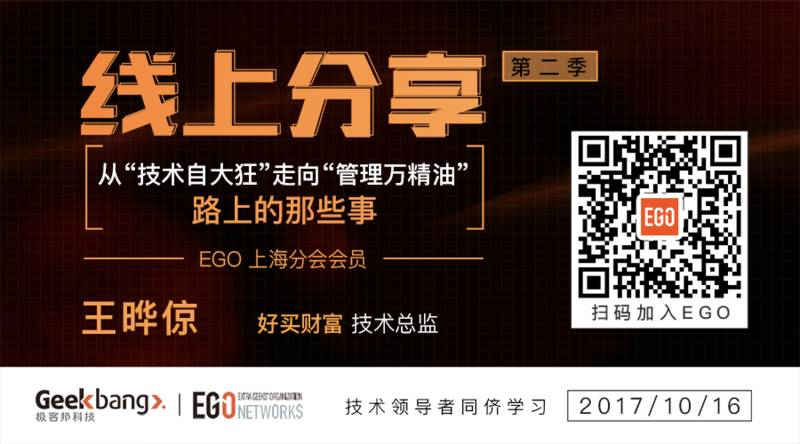 10 月 23 日,EGO 上海分会会员、好买财富平台架构部技术总监王晔倞作为 EGO 线上分享第二季嘉宾,与超过 400 位 EGO 会员交流了自己从程序员到现在的 17 年成长踩坑经历。本文根据当天口述内容整理。