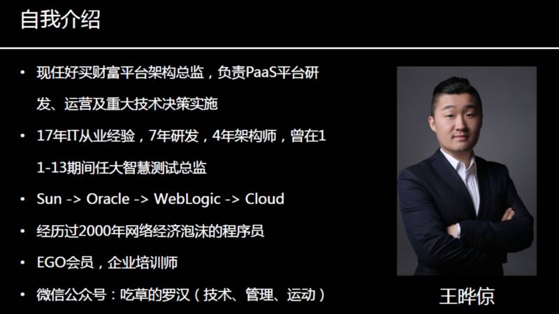 我是王晔倞,是 EGO 上海分会第 9 小组的组长,在好买财富平台架构部担任技术总监,主要负责公司的 PaSS 平台研发运营和技术决策。我在 2000 年踏入 IT 圈,经历了 2000 年的互联网泡沫,做过七八年的研发和四五年的架构师,在 2011 年左右转型做技术管理。我同时是企业讲师,做技术和非技术的咨询培训。