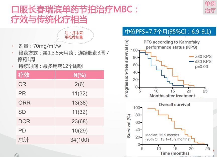 在一项II期研究中,长春瑞滨软胶囊单药节拍化疗治疗老年晚期乳腺癌患者,疗效与传统化疗相当。研究入组了34例晚期乳腺癌患者,患者中位年龄为74岁(范围:70-84岁),接受长春瑞滨软胶囊70mg/m2/w口服(并未采用最佳推荐剂量),分别在每周第1,3,5天用药,每4周为1个周期,连用3周停药1周,最多用药12周期。主要研究终点为客观缓解率。结果显示,2例(6%)患者取得CR,11例(32%)患者取得PR,客观缓解率为38%。总体人群的中位PFS和中位OS分别为7.7个月和15.9个月。此外,长春瑞滨软胶囊单药节拍化疗治疗的毒副作用小,无3-4级不良事件发生,没有患者因为药物毒性需要减量或停药。