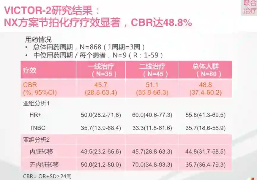I -II期VICTOR-1研究评估了长春瑞滨软胶囊联合卡培他滨节拍化疗治疗既往经治的局部晚期或转移性乳腺癌患者。研究入组了34例既往接受过蒽环和紫杉类药物治疗,或不适合蒽环紫杉类治疗的经治患者。研究旨在评估联合方案的耐受性,并探索最佳推荐剂量。初步的研究结果提示,口服长春瑞滨 40mg 3次/周联合口服卡培他滨 500mg tid 连续给药治疗可行且耐受良好,在延长治疗期间亦是如此。