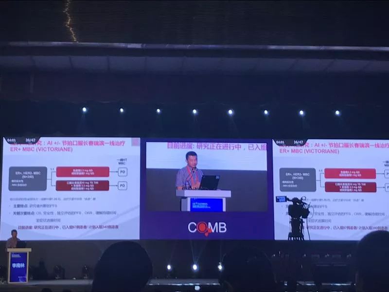 • VICTORIANE研究: 随机III期研究:AI +/- 节拍口服长春瑞滨一线治疗ER+ MBC。入组绝经后未经治疗的HR+/HER2–MBC,随机1:1分配接受来曲唑或阿拉曲唑,qd(A组)vs 长春瑞滨 50mg,q3w联合来曲唑或阿拉曲唑,qd(B组)。患者持续用药直至疾病进展或其他原因停药,28天为1个治疗周期。主要终点为研究者评估的PFS。