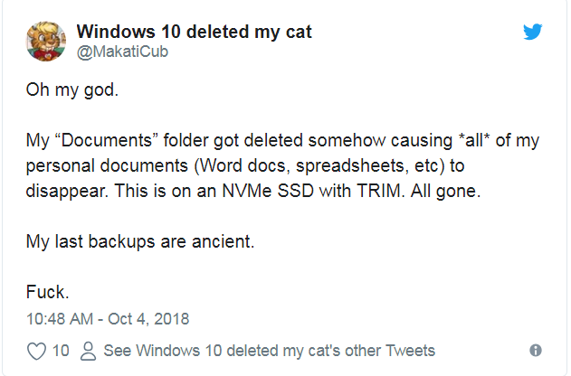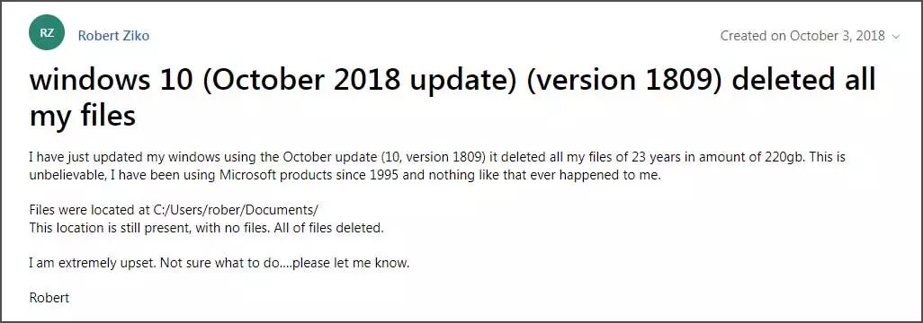 用户反映的最严重问题显然是,他们在安装Windows 10 October 2018 Update后,发现丢失了大量文件。 Twitter论坛和微软论坛上的众多用户都在反映这个问题。