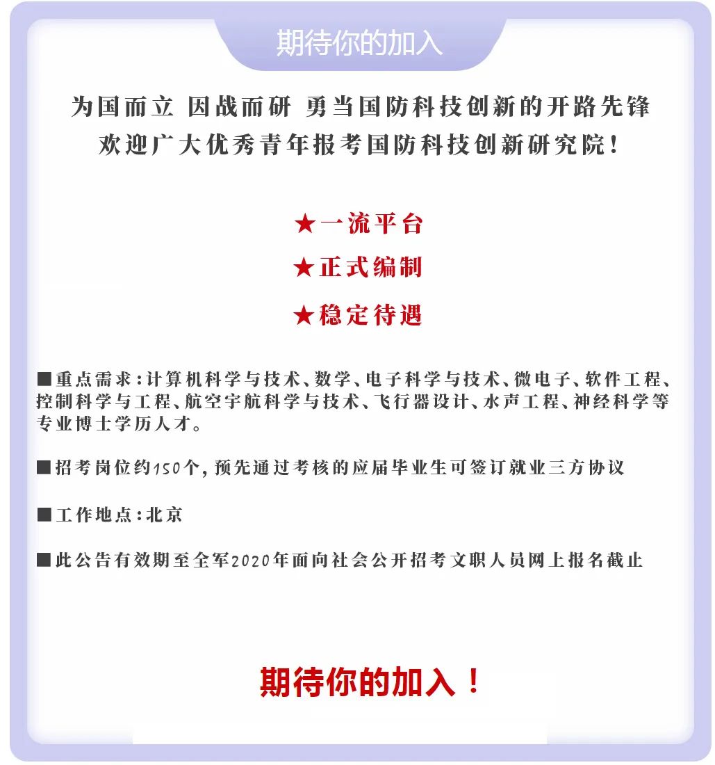 博研学历:先期可投递简历至:jskxyjob5@163.com,进行初步筛选联系(专业对口、考核优秀的可签订就业三方协议)。待全军文职人员招考岗位计划公布,通过军队人才网,即中国人民解放军专业技术人才网:HTTP://WWW.81RC.MIL.CNHTTP://81RC.81.CN,登陆2020年全军面向社会公开招考文职人员报名入口,提交报名信息及选择意向岗位,审核通过后直接参加专家组面试考核(不参加全军统一考试),经政审、体检后入职。