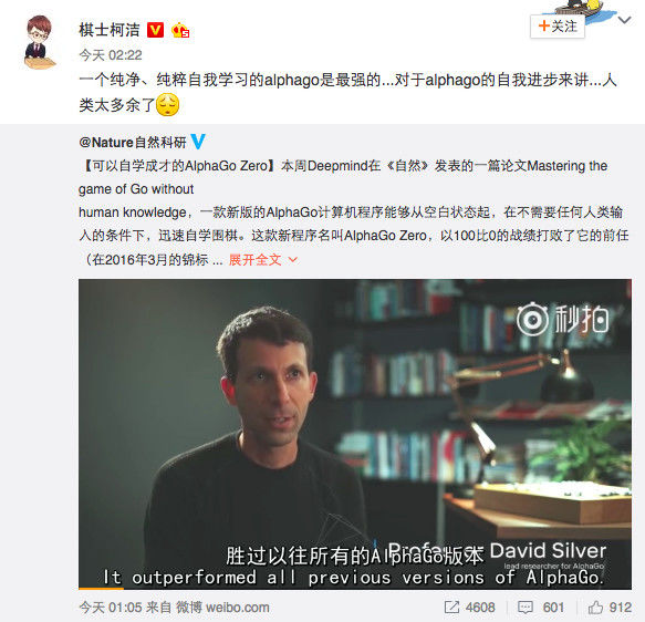 在今天凌晨,曾与AlphaGo有过交战的柯洁在第一时间做出回应,柯洁表示,“对于AlphaGo的自我进步来讲...人类太多余了”。