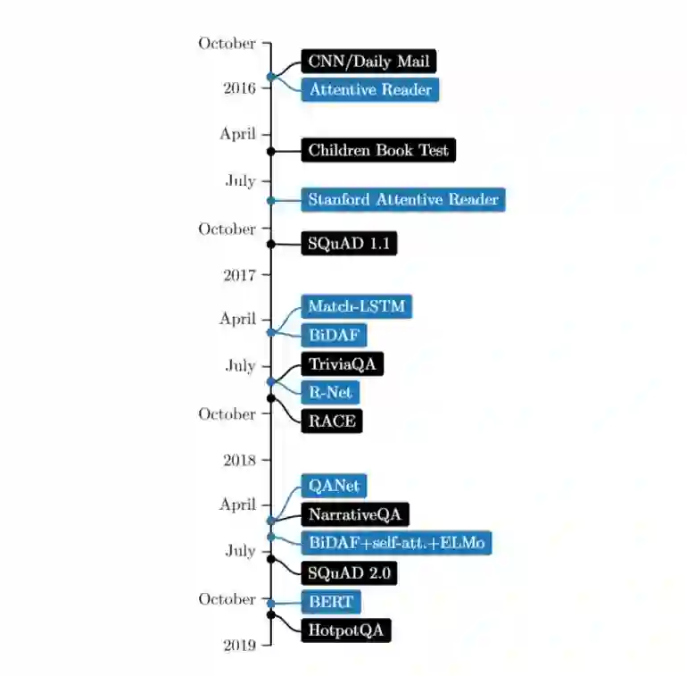 神经阅读理解的发展历程:数据集(黑色)与模型(蓝色):