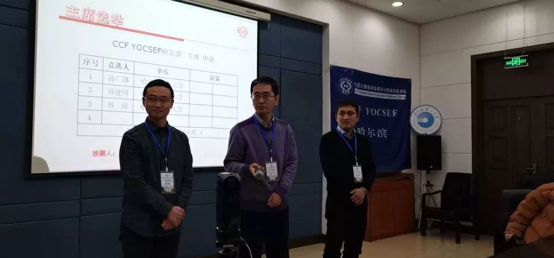 新一届主席会议成员的选举异常激烈。来自哈尔滨工业大学的韩琦、哈尔滨理工大学的孙广路和哈尔滨工程大学的孙建国参加了主席竞选。参选人首先分别进行了4分钟的竞选演讲,阐述发展理念和未来计划。演讲结束后,参选者就现场其他委员、总部及兄弟论坛代表的犀利提问进行了10分钟的答辩,进一步阐明各自对哈尔滨分论坛未来发展的建议和想法。在统计投票过程中,南京现任主席肖亮即兴赋词一首“青门饮祝冰城”表达了对YOCSEF哈尔滨的美好祝愿。