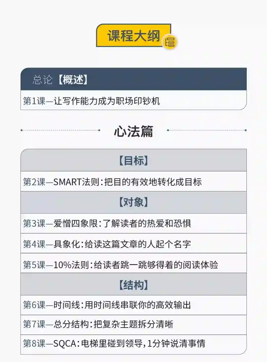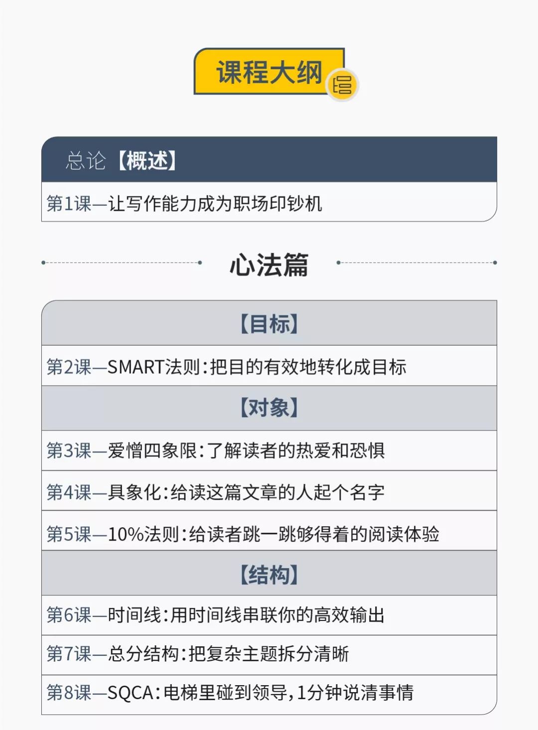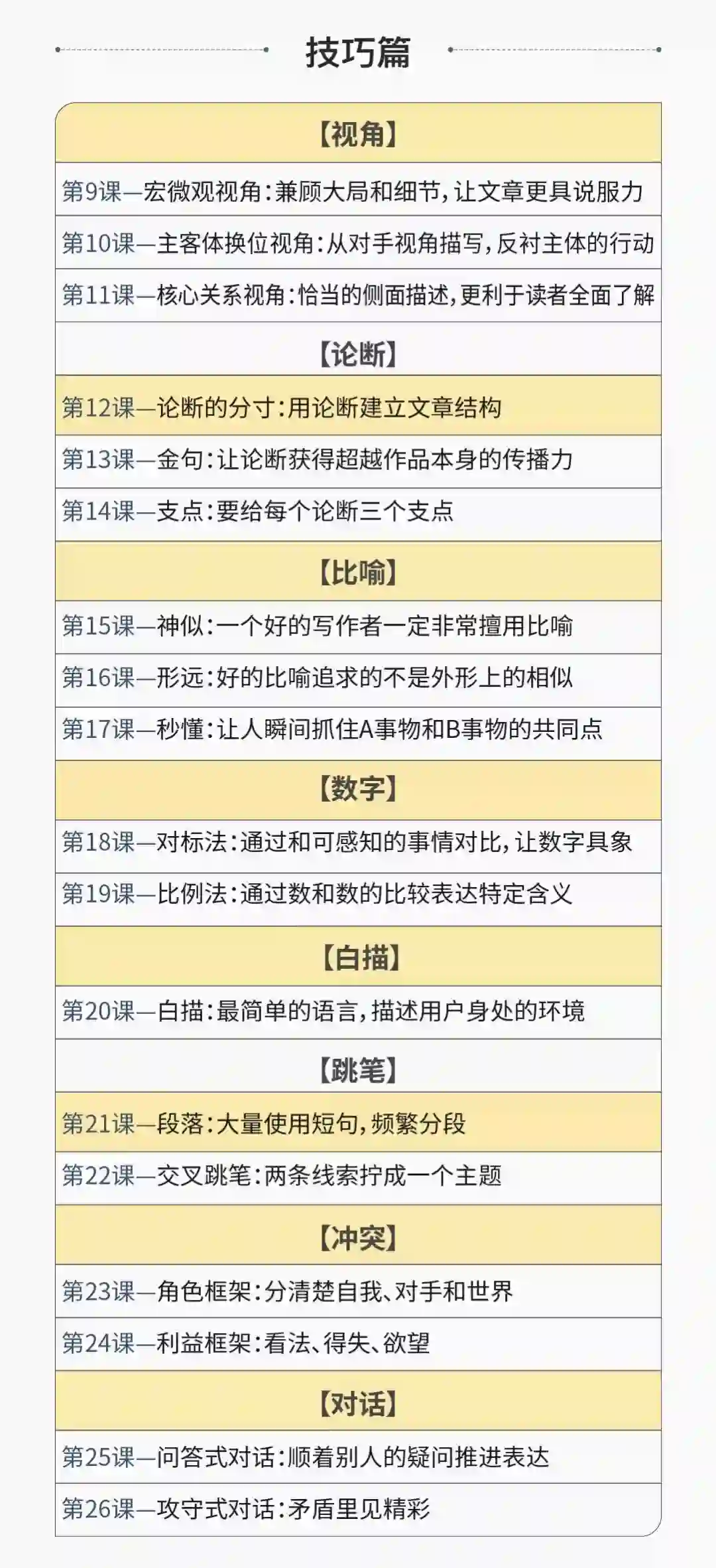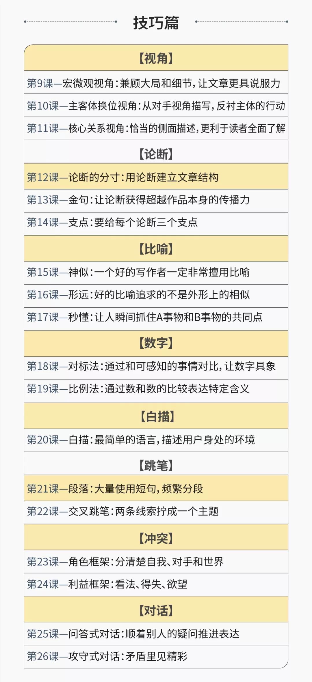 整个课程展开由浅入深,比如在最初的3节课,告诉你写作必备的3个心法,掌握它,你的写作就优于50%的人,比如技法篇,告诉你如何活灵活现地呈现“数字”,如何用“对话”激活全文。