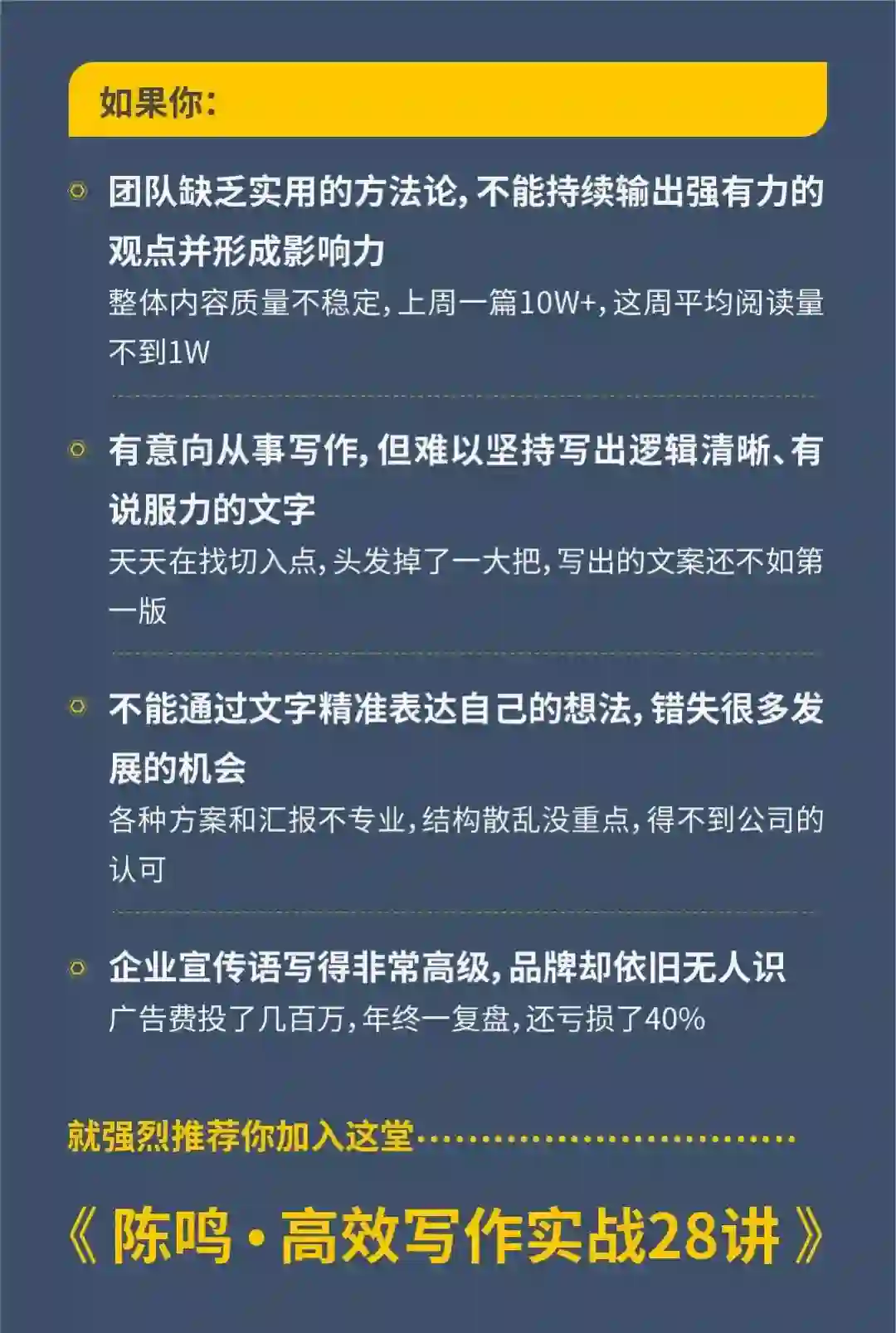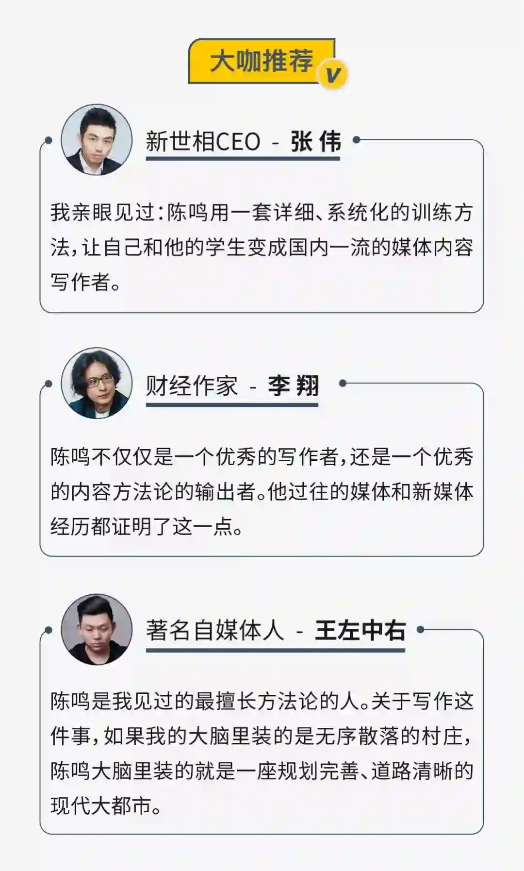 有的学员投石问路,同时购买了几套写作课程。案例学了一大堆,最后发现,真正能帮到自己的,其实是陈鸣老师的方法论。