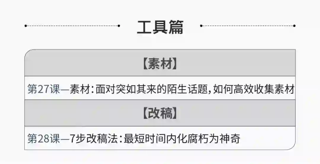 课程的最后,还会为你分享独家的7步改稿法。老话说,好文章都是改出来的。曹植可以七步成诗,今后你也可以七步改好一篇稿子。