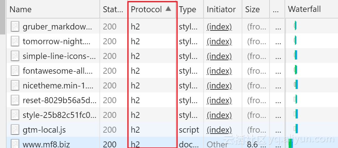 通过浏览器的开发者工具,我们可以在 Network 栏目中看到 Protocol 中显示 h2 有无来判断。