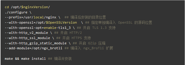 后续还有相关变量设置和设置服务、开启启动等步骤,篇幅限制就省略了,这篇文章有介绍在 Ubuntu 下的 Nginx 编译:https://www.mf8.biz/ubuntu-nginx/ 。