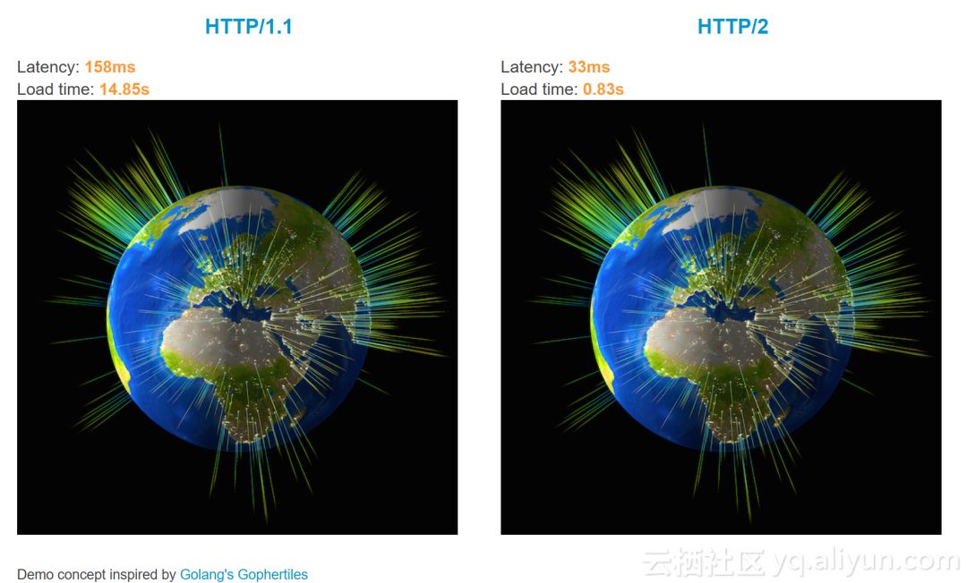 在 Akamai 的 HTTP/2 DEMO中,加载300张图片,HTTP/2 的优越性极大的显现了出来,在 HTTP/1.X 需要 14.8s 的操作中,HTTP/2 仅需不到1s。