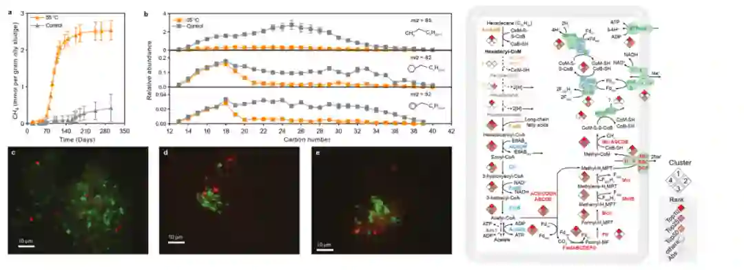 该研究通过对胜利油田样品的长时间富集培养,获得了一类新型的产甲烷古菌(Candidatus Methanoliparum)。通过荧光原位杂交、稳定碳同位素标记培养、宏基因组和宏转录组测序、高分辨质谱等一系列分析结果,证明Ca. Methanoliparum可以直接氧化长链烷基烃,并通过β-氧化、Wood-Ljungdahl途径进入产甲烷代谢,而不需要通过互营代谢来完成。