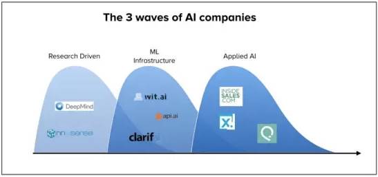 人工智能的第一次浪潮中出现的大多是纯粹科研性质的公司,但绝大多数这类企业还没有真正实现商业化,有些在盈利前就被收购。第二波热潮的公司更多致力于构建机器学习的基础设施,这些初创公司的确创造了一定商业价值,但大多也在形成规模前被收购。随着数据和技术的支持,第三次 AI 创业浪潮的主题是应用人工智能的解决方案。这类初创公司与以往的区别是,他们会针对特定产业或领域开发终端应用,而不仅仅是构建基础设施。