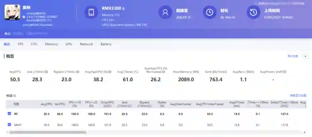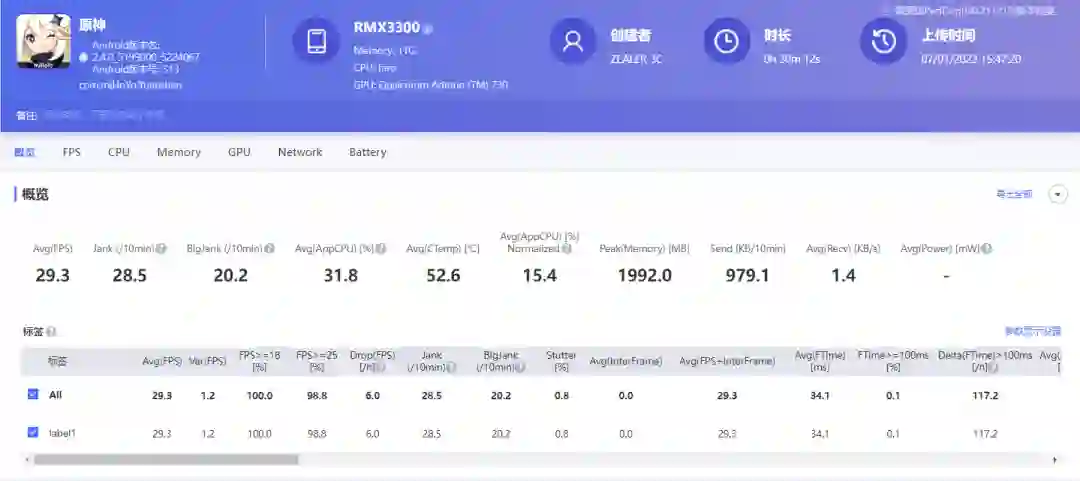 性能方面,realme GT2 Pro 搭载了 2022 年将会统一分配的骁龙 8 Gen1,我们拿到的是 12GB+256GB 的版本,可以看到在设置中 realme 叫它全新一代骁龙 8 5G 移动平台,不只是 realme,好像大家都叫这个,大概骁龙自己也觉得这个名字实在是不怎么好念。是骡子是马牵出来溜溜,让我们来用大型开放世界测试软件“原神”来实测一下,室温 26 摄氏度,手动 300nit 亮度,画质拉满,关闭动态模糊,开启 60 帧,30 分钟夜间璃月港闲逛。这成绩,我是拿错手机了吗?别说 60 帧,平均不到 30 帧的成绩对于这种动作游戏完全不可玩啊,这个成绩就连 888 也能做到啊,难道高通这次只是 PPT 提升吗?