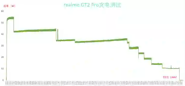 为了解决激进性能调度所带来的高功耗需求,realme GT2 Pro 内置了一块 5000mAh 的大电池,并且支持 65W 快充。经过我们实测,realme GT2 Pro 能够在 38 分钟的时间里将电量从 1% 充至 100%,最高实际充电功率保持在前两分钟内的 54W 左右,具体充电功率梯度变化图如下: