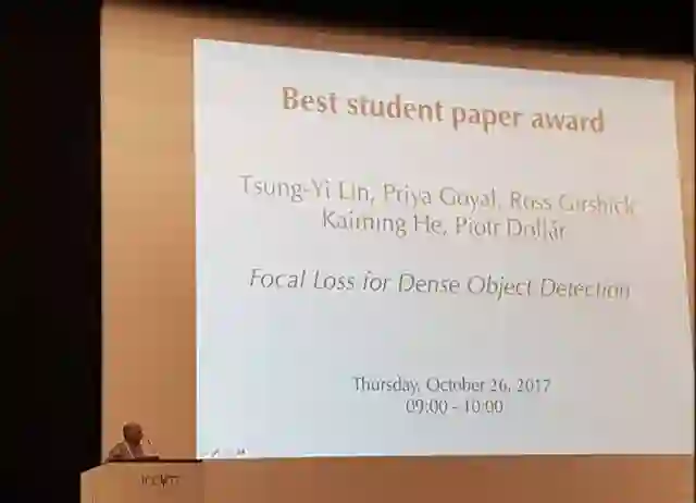 最佳学生论文的第一作者 Tsung-Yi Lin 博士毕业于康乃尔大学纽约理工学院,这是他在 Facebook 工作时进行的研究。Tsung-Yi Lin 最著名的工作是他在微软期间提出的 Coco 数据集(论文:《Microsoft coco: Common objects in context》)。目前,Lin 加入了 Google Brain 任研究科学家。