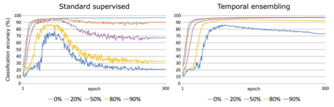 对于 Temporal ensembling Model,其整体框架与 Π Model 类似,在获取无标签数据的信息上采用了相同的思想,唯一的不同是:
