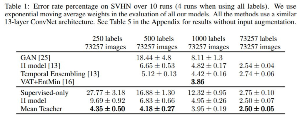 与其他技术方案相比,在某些情况下,Mean Teacher 技术没有 VAT 的方案表现优秀。对于这一点,论文作者也提到,由于两个方案切入维度不同,因而二者完全可以互补,从而带来更大的模型提升。