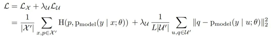 其中,第一项为交叉熵,用于计算有标签数据的误差;第二项为 MSE,用来计算无标签数据与伪标签之间的均方误差,对应前面提到的 Consistency Regulation。