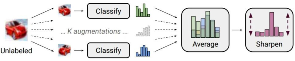伪标签生成:相对于早期的 Pseudo-Label 模型,MixMatch 做了两点改进。第一,运用数据增强技术对无标签数据进行 K 次的变换,模型分别对 K 次变换进行预测,然后取这 K 次结果的平均作为无标签的期望结果。第二,在此基础上,运用 entropy regularization 思想,对于 K 平均之后的结果,再进行锐化操作,使得各类别上的概率值差别更为明显。整体流程如下图所示: