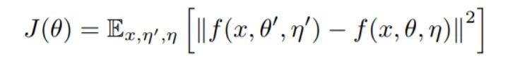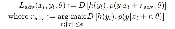 在此思路下,VAT 的目标函数与 Temporal ensembling Model 类似,包含有标签数据部分的交叉熵,以及无标签数据部分的一致性正则项。此处一致性正则项的数学形式如下: