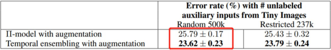 即使在完整数据集下,此论文所提出的方法也比纯监督的方法更优,额外提升 0.5 个百分点。这说明本文所采用的一致性正则项完全可以充当通用的正则项,用来约束模型对于输入的局部噪声不敏感。