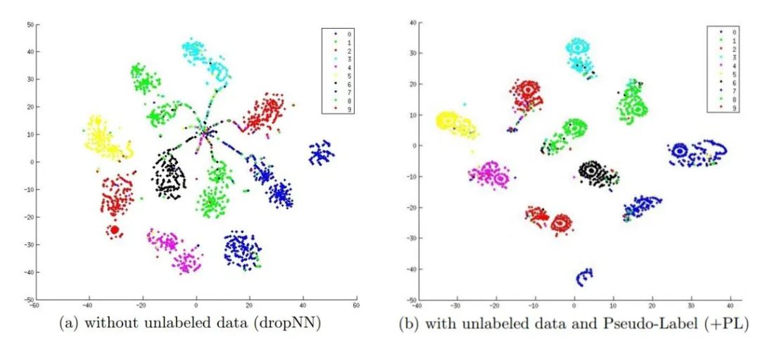 对比上面左右两张图可以看出来, Pseudo-Label 模型相对于单独的有监督模型,可以有效改善各类别数据在空间中的聚集密度。