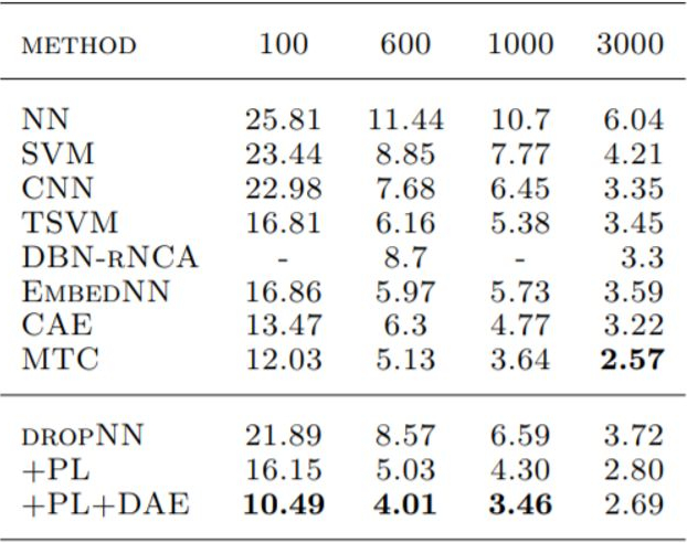 其中也包括 2.1 中提到的 Pseudo-Label 模型。尤其值得一提的是,Ladder 仅仅采用了不到 1% 的有标签数据就实现了 1% 的错误率,与完整数据集相比,仅低了 0.5%。