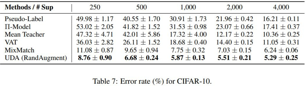 由此可知,UDA 与前面提到几个半监督模型相比,本身在半监督学习框架上并没有太大的创新,其贡献更多的是将近年来深度学习领域其他的新技术和新思想结合进半监督学习中。
