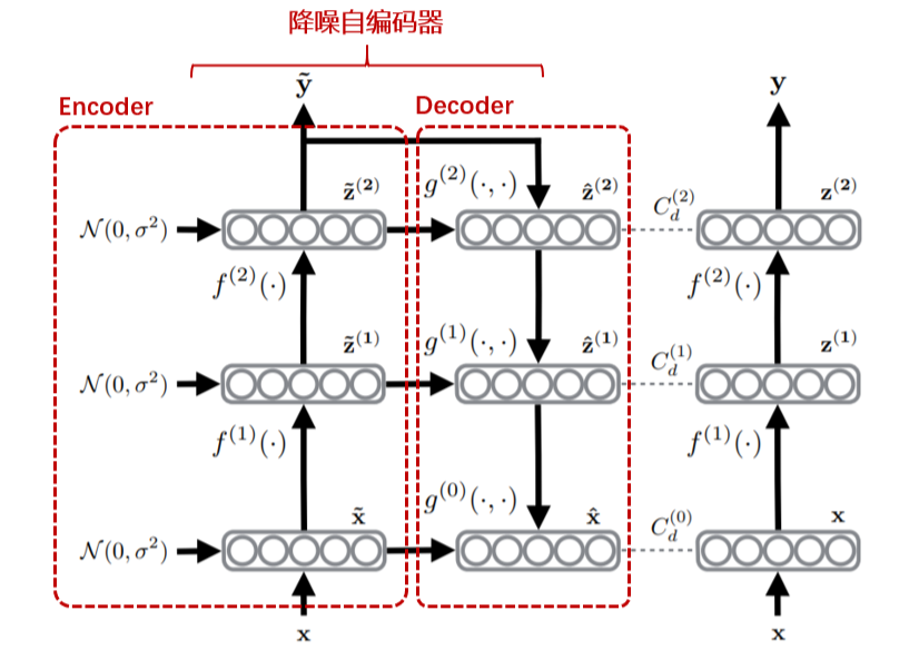 对于有标签数据,数据只会流经降噪自编码器的 Encoder 模块,并通过顶层的输出与原始输入构建有监督的目标函数。