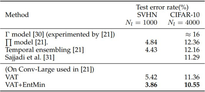 为了和其他半监督学习方法进行对比,研究人员分别在 SVHN 和 CIFAR-10 数据集上进行实验验证。从上表中可以看出,单独的 VAT (目标函数仅包含前两项)与 Temporal ensembling Model 在两个数据集上互有胜负,这取决于具体的数据集特征。