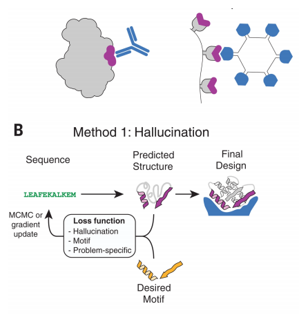 第一种方法叫Constrained hallucination,通过在序列空间中进行梯度下降以优化损失函数,并辅以特定问题的交互项,以设计候选免疫原呈现被中和抗体识别的表位,用于抗逃逸病毒抑制的受体陷阱,金属蛋白和酶,以及具有围绕已知结合基序扩展的设计界面的靶结合蛋白。