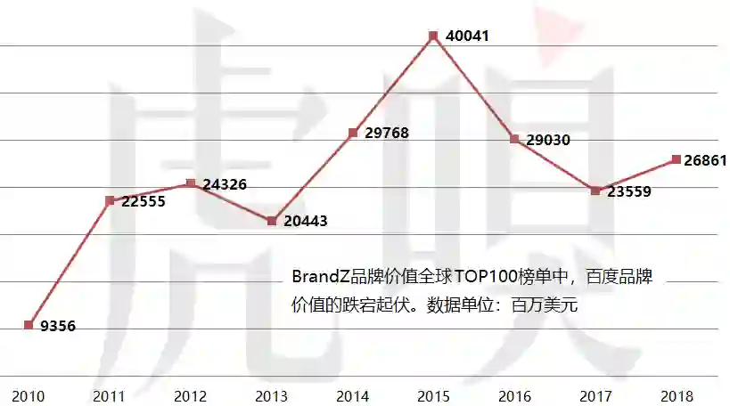 百度确有重新向上的迹象。在全球知名品牌价值榜单BrandZ上——该榜单评分参考了财务指标和消费者品牌认知——百度这些年的动荡波折被体现得淋漓尽致:2011年一统赛道后的飞跃、2013年移动化触礁下沉、2015年移动搜索稳超PC后大幅上涨、2016多事之秋跌落神坛,2017年逐渐企稳,2018年重现增长态势。