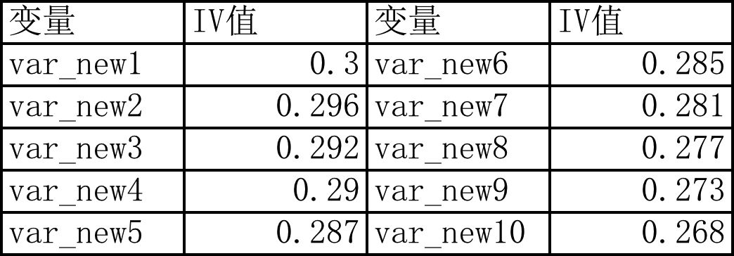 30个原始变量的IV值倒序结果如表1展示(变量本身进行了脱敏),我们发现,预测能力最强的变量具有IV值0.170(var7,即变量7)。