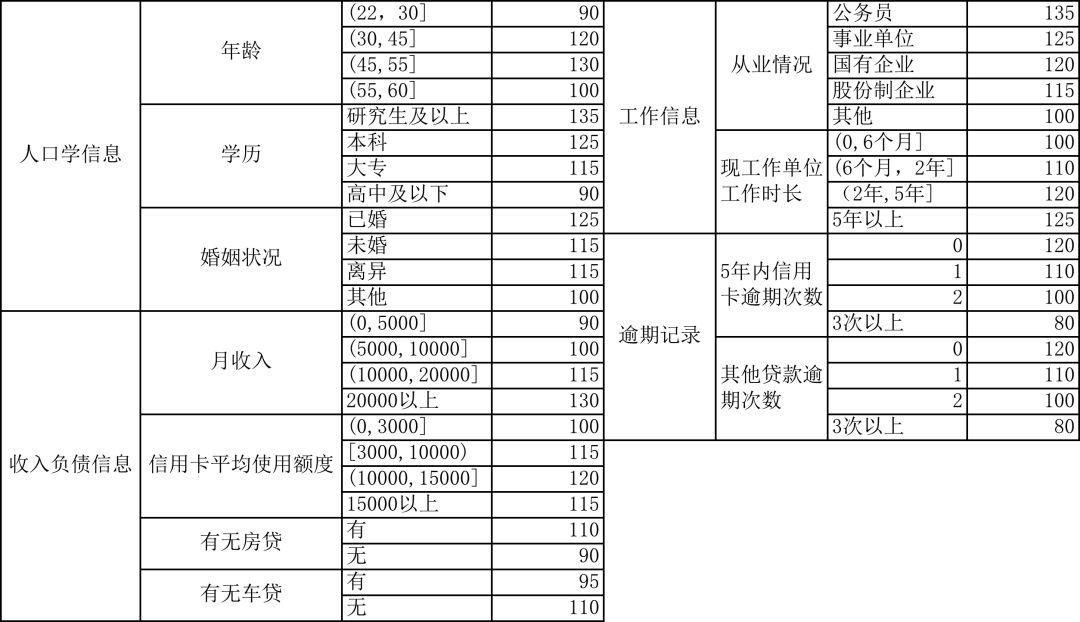 三,信用评估。在传统的信用评估领域,评分卡(score card)是一个被广泛使用的技术和方法。评分卡根据用户的申请资料对用户进行打分,根据用户最终的得分决定是否给用户授信。以下是一张典型的评分卡示例: