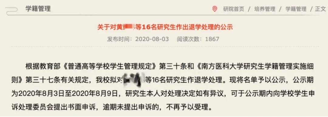 通告称:根据教育部《普通高等学校学生管理规定》第三十条和《南方医科大学研究生学籍管理实施细则》第三十七条有关规定,我校拟对黄某某等16名研究生作退学处理。现将名单予以公示,公示期为2020年8月3日至2020年8月9日,研究生本人对处理决定如有异议,可于公示期内向学校学生申诉处理委员会提出书面申诉,逾期未提出申诉的,不再予以受理。