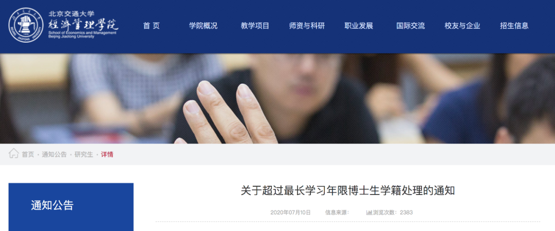 7月10日,北京交通大学经济管理学院发布《关于处理超过最长学习年限博士生学籍的通知》,因超过全日制博士(含本科毕业生直接攻读博士学位研究生)最长学习年限的59名博士生,对其学籍管理将作出分类处理。
