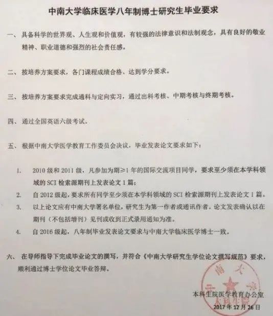 简单来讲就是2017年,中南大学湘雅医学院临时出通知,要求 2010 级,2011 级赴外交流学生及 2012 级全体学生发表一作 SCI 论文后才能毕业,但这让 10、11、12 级的学生陷入一个尴尬的处境。