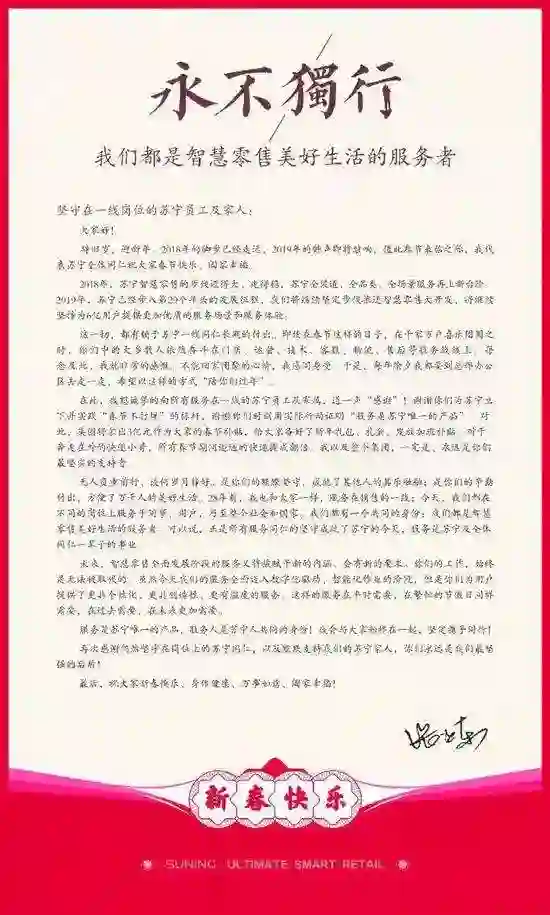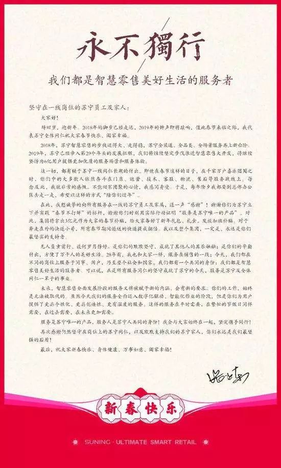 信里写道:“谢谢你们为苏宁立下并实践‘春节不打烊’的标杆,谢谢你们时刻用实际行动证明‘服务是苏宁唯一的产品’”。
