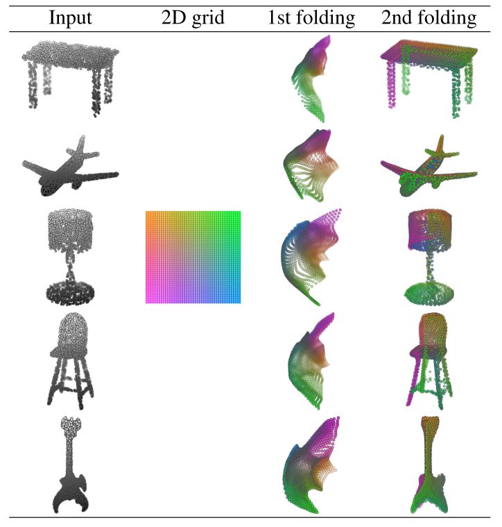自动编码器中瓶颈层的输出称为码字(codeword),可用作输入点云的高维嵌入。我们将展示二维栅格结构不仅仅是用于成像的采样结构,而且可以通过我们所提出的折叠操作来构造点云。